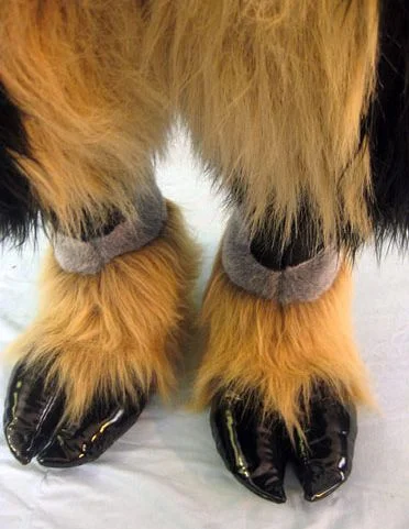 Our standard handpaws are a cartoony four-fingered design, but we also craft special hands, wings and hooves for certain species. The wrists are long for full coverage and are lined at the openings. Rather than building feet around shoes, we have developed our own design with high-density foam insoles attached to extra-thick spandex liners that stretch to fit a range of different foot sizes.